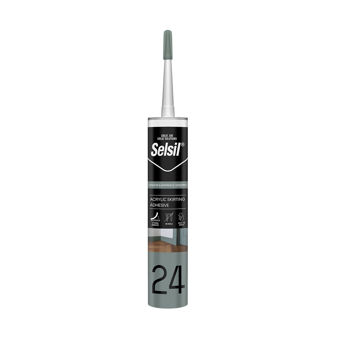 Selsil Acrylic Skirting - це з'єднувальний і монтажний клей на водній основі і використовується на всіх поверхнях будівель замість цвяхів і гвинтів.