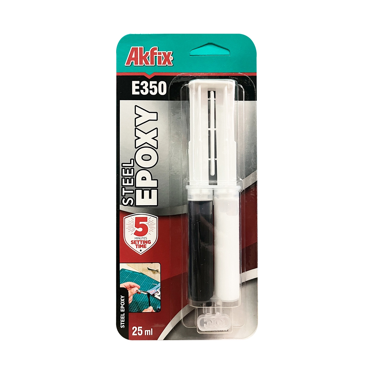 Akfix E350 – це двокомпонентний надзвичайно міцний клей для металевих з'єднань на епоксидній основі. Характеризується високою міцністю та швидким тверднінням, не містить розчинників. Здатність заповнення проміжків (прогалин) робить цю клейову систему придатною для застосування на нерівних і погано прилягаючих поверхнях.