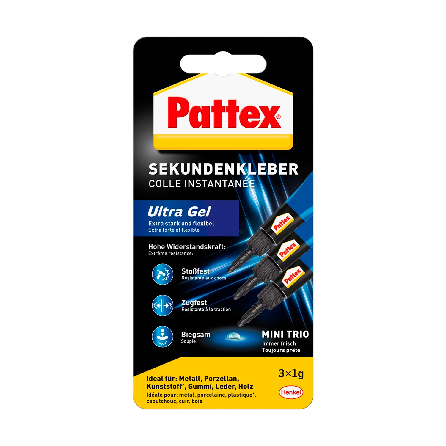 PATTEX Міні Тріо Гель секундний клей (3 штуки по 1 граму) призначений для міцного, водостійкого та швидкого з'єднання невеликих елементів з металу, деяких видів пластмас, кераміки, фарфору, дерева, шкіри, картону. Найкраще працює на вертикальних поверхнях, оскільки добре тримає форму або для ситуацій, де треба наростити шов.