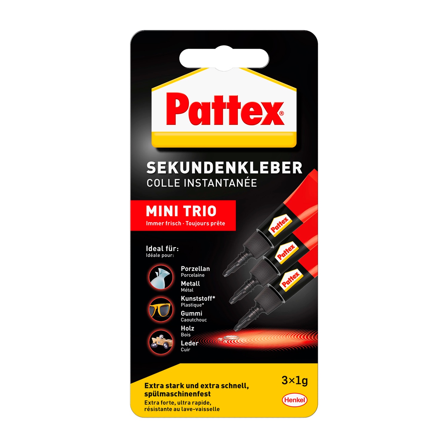 PATTEX Міні Тріо рідкий секундний клей (3 штуки по 1 граму) призначений для міцного, водостійкого та швидкого з'єднання невеликих елементів з металу, деяких видів пластмас, кераміки, фарфору, дерева, шкіри, картону. Найкраще працює на вертикальних поверхнях, оскільки добре розтікається.