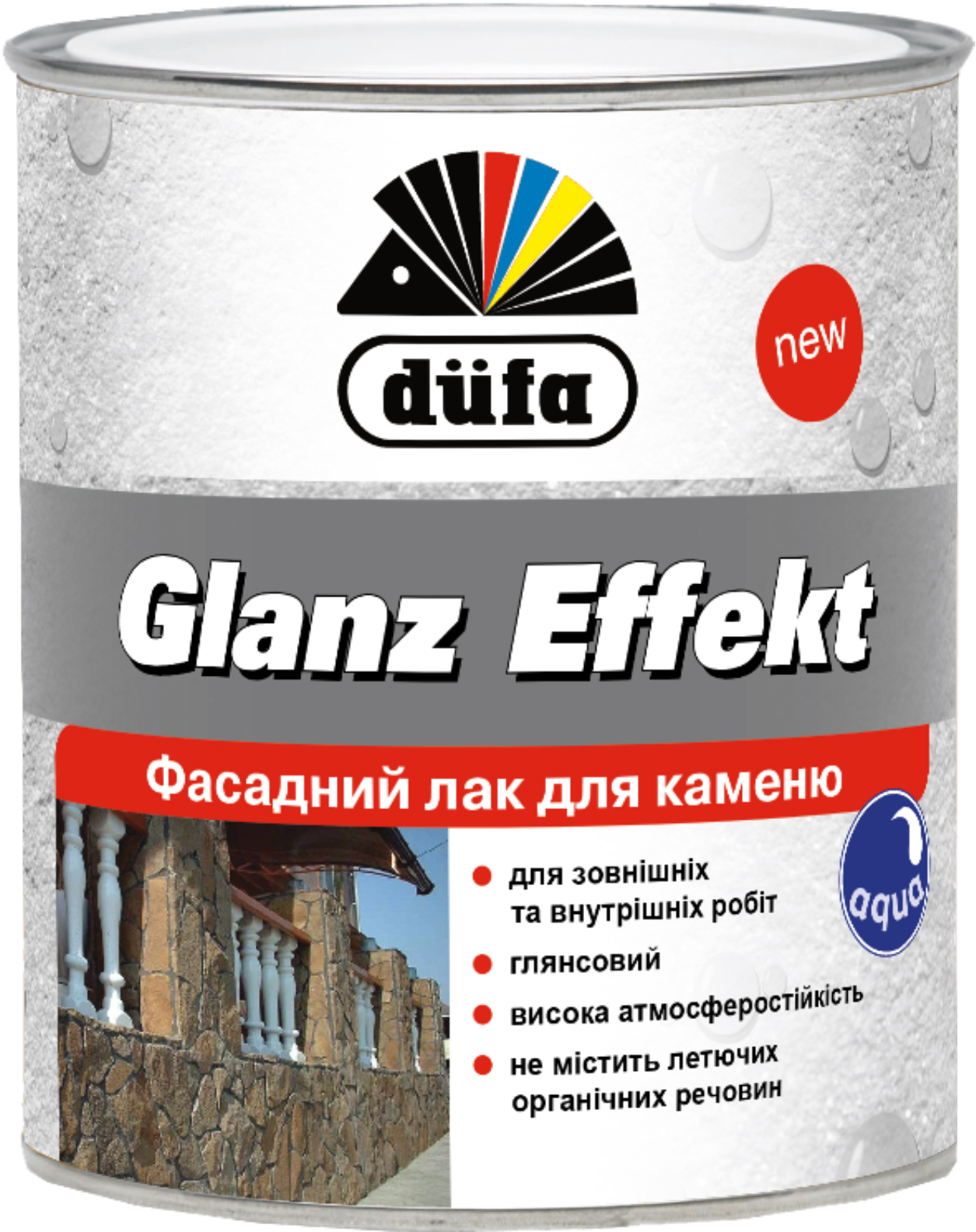 Прозорий водно-дисперсійний акриловий лак для захисту і декоративного оформлення природного і штучного каменю, бетонних елементів, цементних та гіпсових штукатурок, поверхонь, пофарбованих водно-дисперсійними і алкідними фарбами. Дозволяє отримати ефект «мокрого каменю» на мінеральних поверхнях. Захищає конструкції від впливу вологи, істотно збільшує термін експлуатації фасадів. Безпечний для навколишнього середовища.