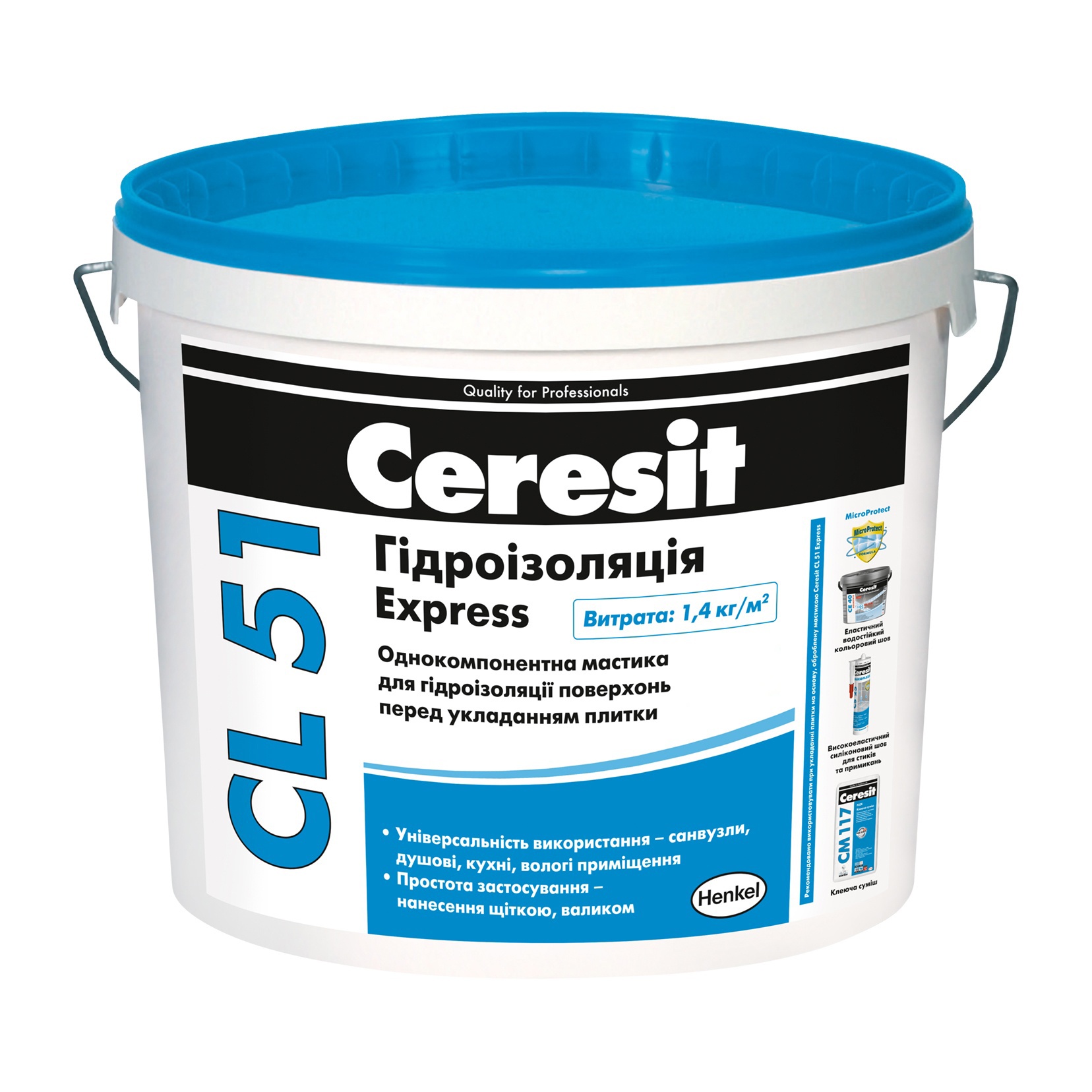 Ceresit CL 51 Гідроізоляція Express – це однокомпонентна мастика для гідроізоляції поверхонь всередині приміщень, які експлуатуються у вологому середовищі, крім басейнів.