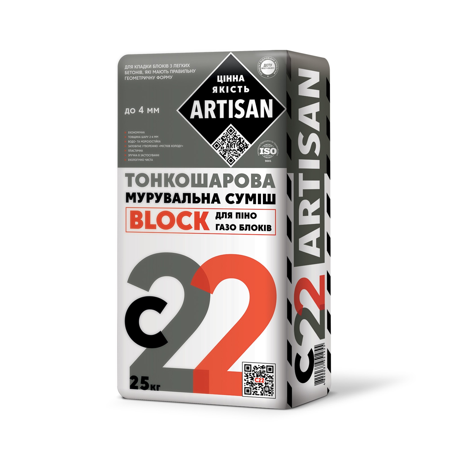 Artisan C-22 – це тонкошарова мурувальна суміш, призначена для мурування зовнішніх та внутрішніх стін піно- газо- та силікатними блоками з’єднаними тонкими швами. Висока пластичність розчину дозволяє мінімально зменшити товщину шару розчину 2-4 мм, що значно зменшує витрату суміші, запобігає утворенню «містків холоду» та зберігає теплозвукоізоляційні характеристики споруди.