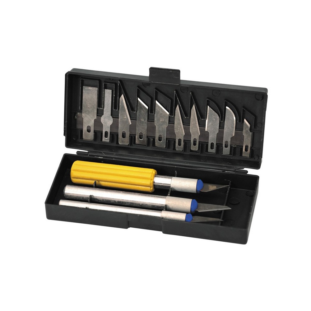 Набір ножів-скальпелів MasterTool - це ручний інструмент, необхідний для кожного моделіста і скульптора по дереву. Леза виготовлені з високовуглецевої сталі. У комплект входять кілька тонких лез для більш тонкого і дрібного різання, а також є менш тонкі леза із загостреннями на кінці. Також до набору входять 3 ручки з цанговими патронами для лез і насадок і пластиковий футляр для зберігання.