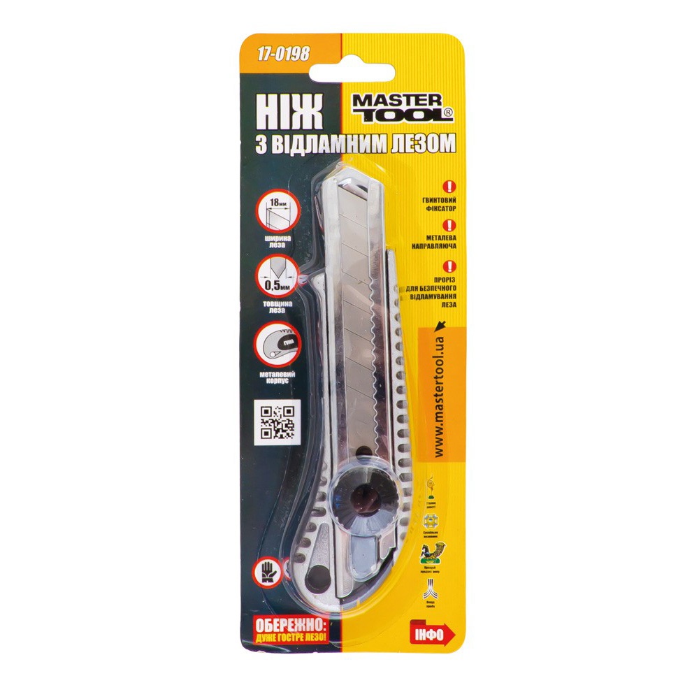 Ніж MasterTool призначений для використання під час монтажних та ремонтних робіт. Має металевий корпус. Лезо ножа виготовлено з високоякісної сталі з лазерним заточуванням, що гарантує відмінну гостроту і довговічність ріжучого полотна. При необхідності лезо легко і швидко замінюється на нове.