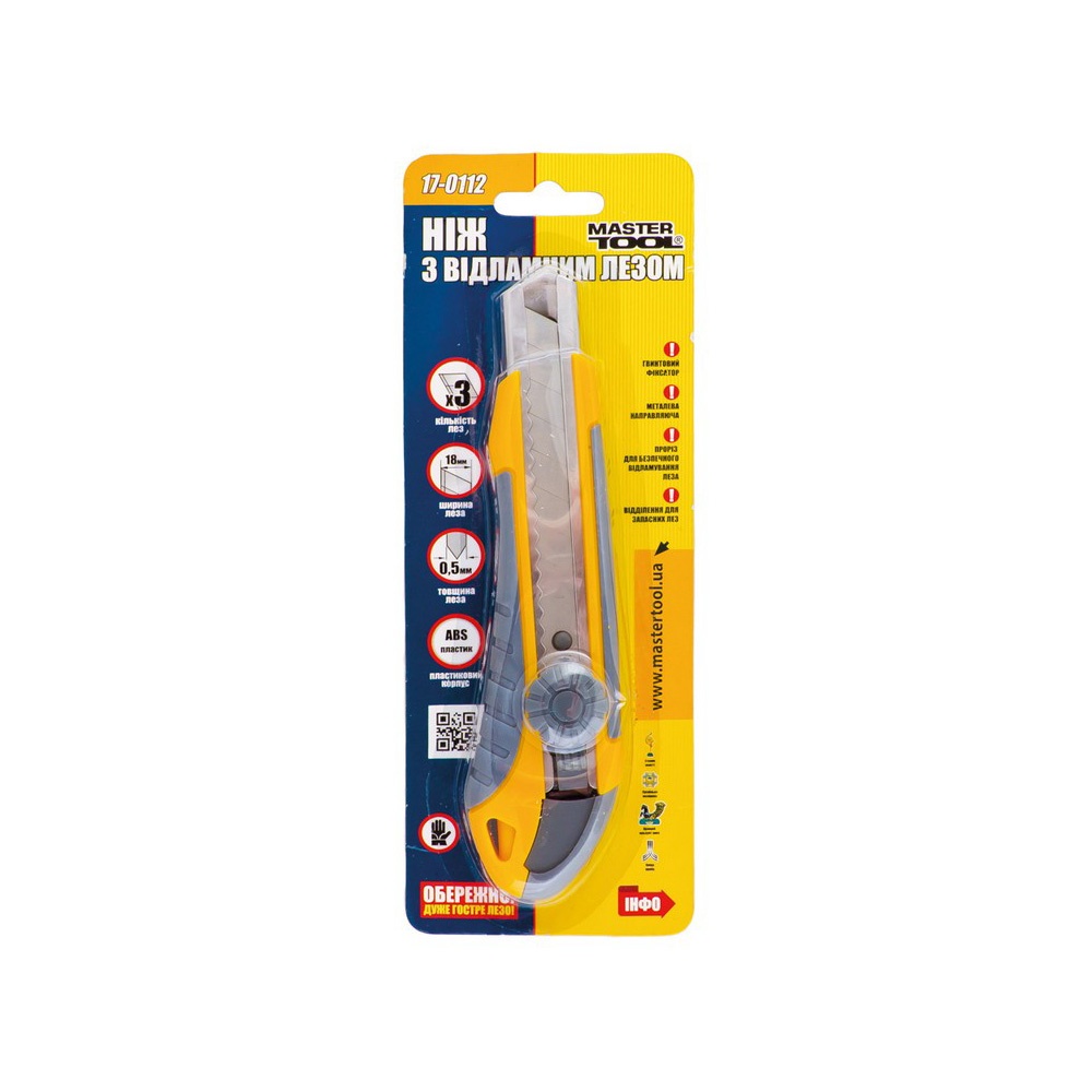 Ніж MasterTool призначений для використання під час монтажних та ремонтних робіт. Має корпус з ударостійкого ABS пластику. Лезо ножа виготовлено з високоякісної сталі з лазерним заточуванням, що гарантує відмінну гостроту і довговічність ріжучого полотна. При необхідності лезо легко і швидко замінюється на нове.