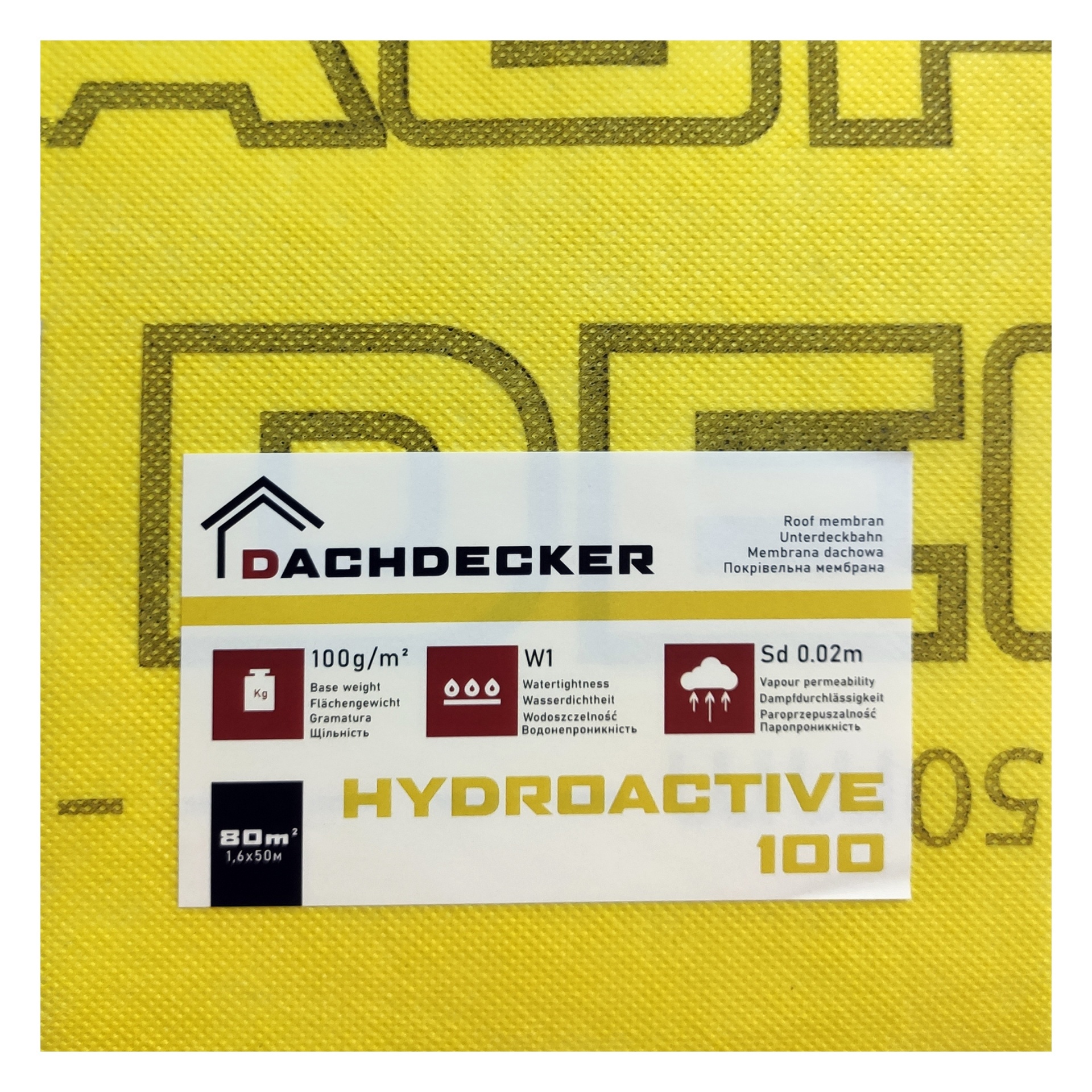 Cупердифузійна мембрана Dachdecker Hydroactive 100 - подвійний шар гідроізоляції на основі нетканого пінопропілену. Продукт активно гідроізоляційний, для використання на покрівлі, стінах та підлозі у якості гідрорегулятора водопроникнення. Завдяки сучасним технологіям, активно опирається водяній парі та усуває ефект «пластикового пакета», що може привести до утворення цвілі та грибків.