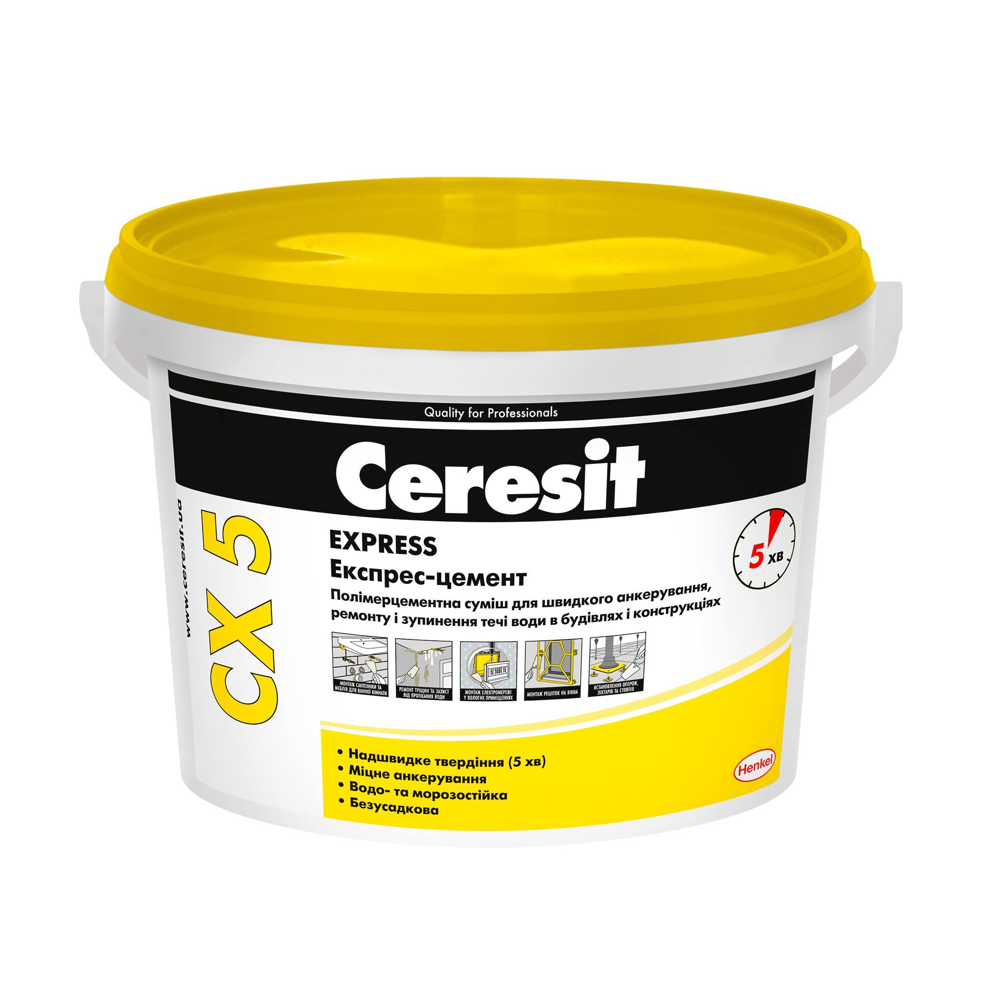 Ceresit Експрес-цемент CX-5 — експрес-цемент для швидкого анкерування, ремонту і зупинення протікання води в будівлях і конструкціях. Заповнення щілин від 5 до 20 мм (при додаванні дрібного щебеню – до 50 мм).
