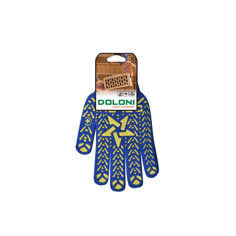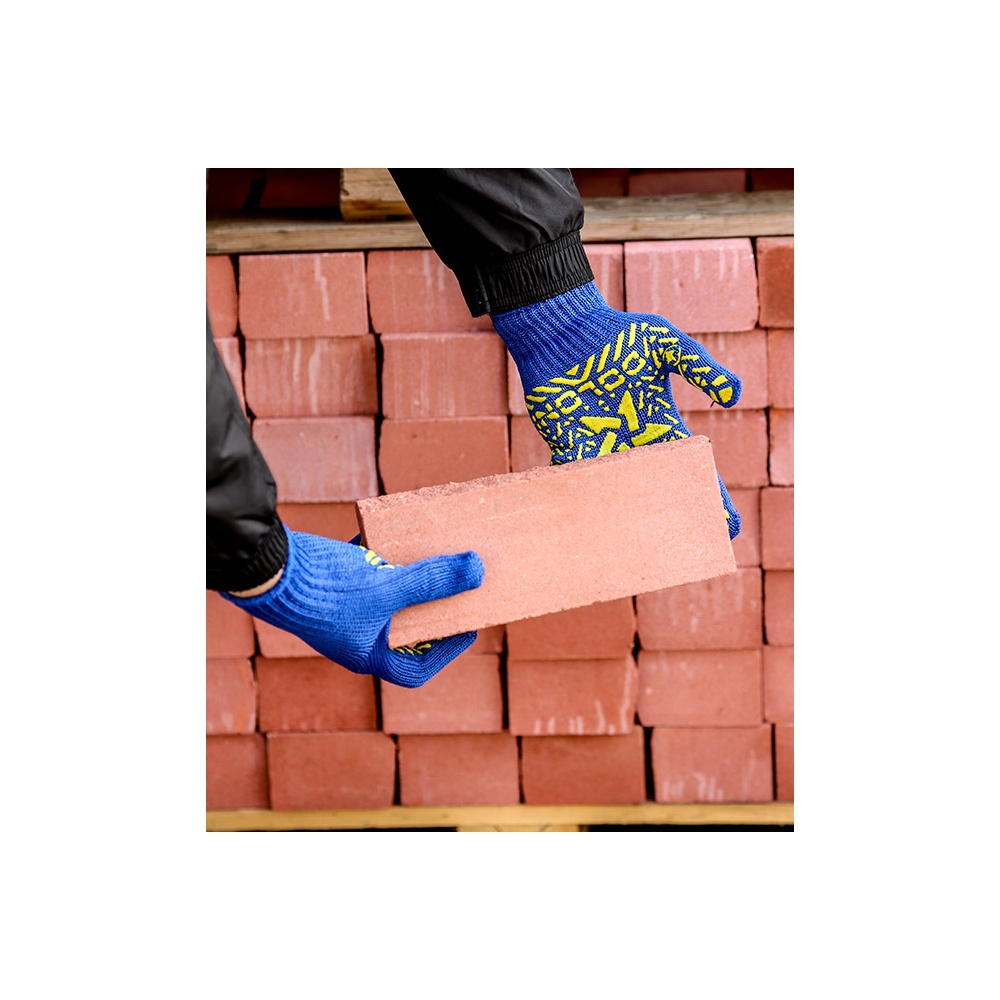 Це трикотажні безшовні захисні рукавички з малюнком ПВХ. ПВХ покриття виконує функцію армування виробу та створює гарне зчеплення зі слизькими предметами, що знижує навантаження на руки. Будівельні робочі рукавички захищають кисті рук та зап'ястя від пошкоджень та забруднень. До складу манжети входить високоміцна нитка. Вироби пропускають повітря та вбирають вологу, що дозволяє зберігати долоні сухими. Тактильно м'які, не ускладнюють рухи, дозволяють працювати з дрібними предметами.