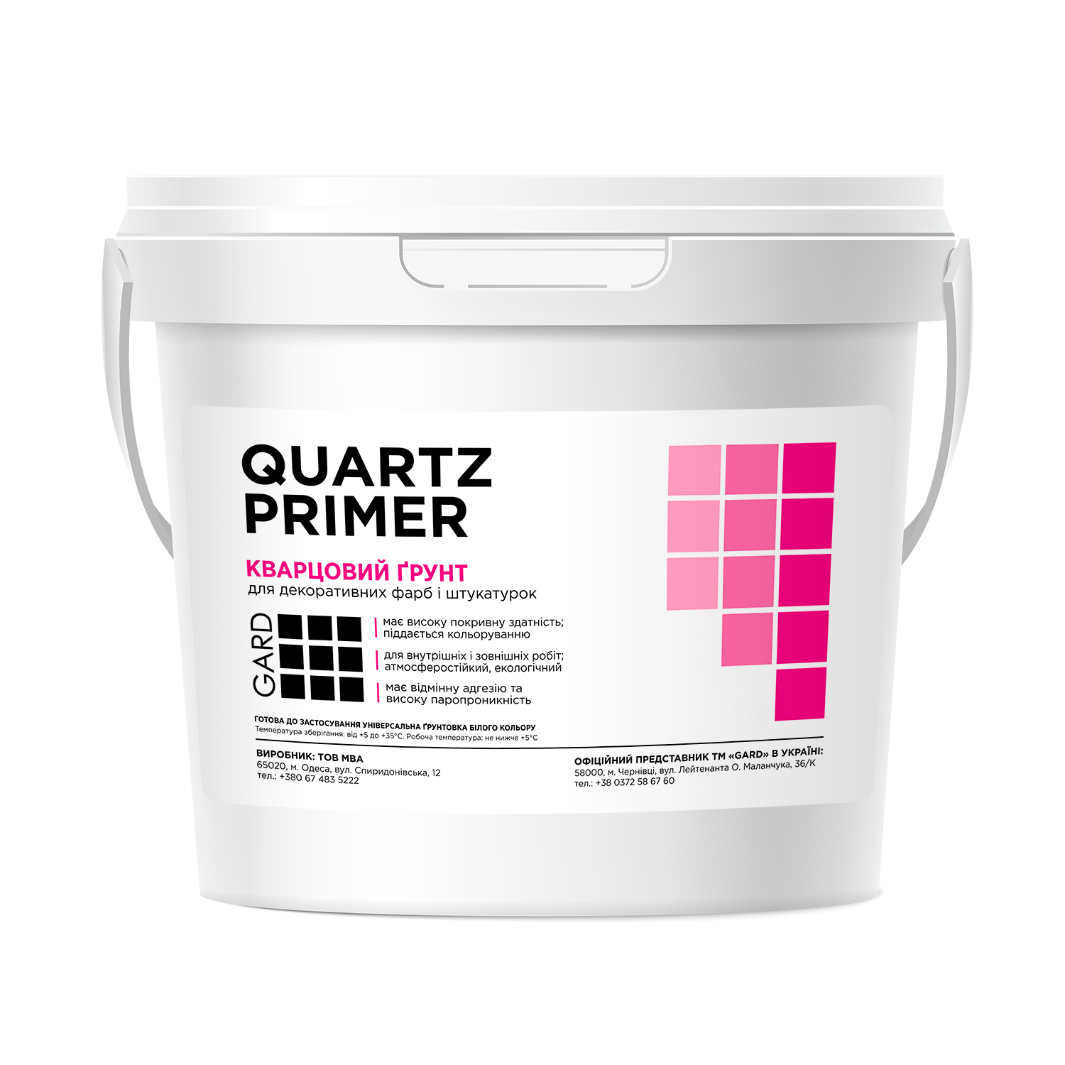 Кварцовий ґрунт GARD Quartz Primer — це рунтовка, що застосовується для внутрішніх і зовнішніх робіт перед нанесенням декоративних фарб і штукатурок в якості грунтовального шару для поліпшення адгезії. Є сумішшю пігментів, наповнювачів і різних допоміжних речовин у водній дисперсії акрилових полімерів з додаванням меленого кварцового зерна. Наноситься на гіпсокартонні та фібро-цементні плити, бетон, цегла, цементні і вапняно-цементні штукатурки, а також зашпакльовані поверхні.