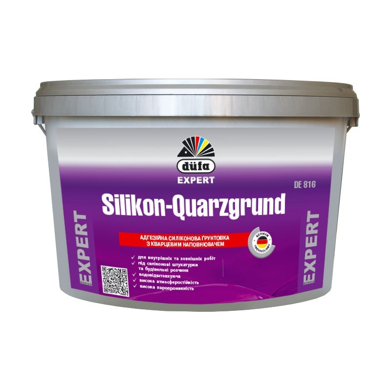 Düfa Silikon-Quarzgrund DE 816 – це адгезійна силіконова ґрунтовка білого кольору. Застосовується для внутрішніх та зовнішніх робіт, містить чистий кварц. Використовується в якості адгезійного покриття перед нанесенням силіконових дисперсійних штукатурок і фарб, для підготовки захисноармуючих шарів систем утеплення, в тому числі виконаних з мінеральної вати, та для зимової консервації фасадів.