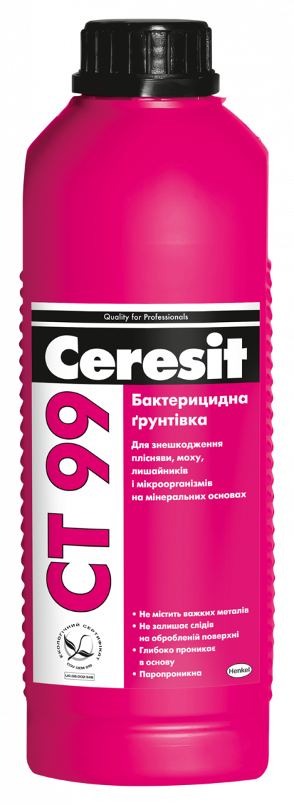 Ceresit CT 99 – це ґрунтовка, призначена для знешкодження плісняви, моху, лишайників і мікроорганізмів на мінеральних основах усередині та зовні будівель. Не застосовується на основах з дерева.