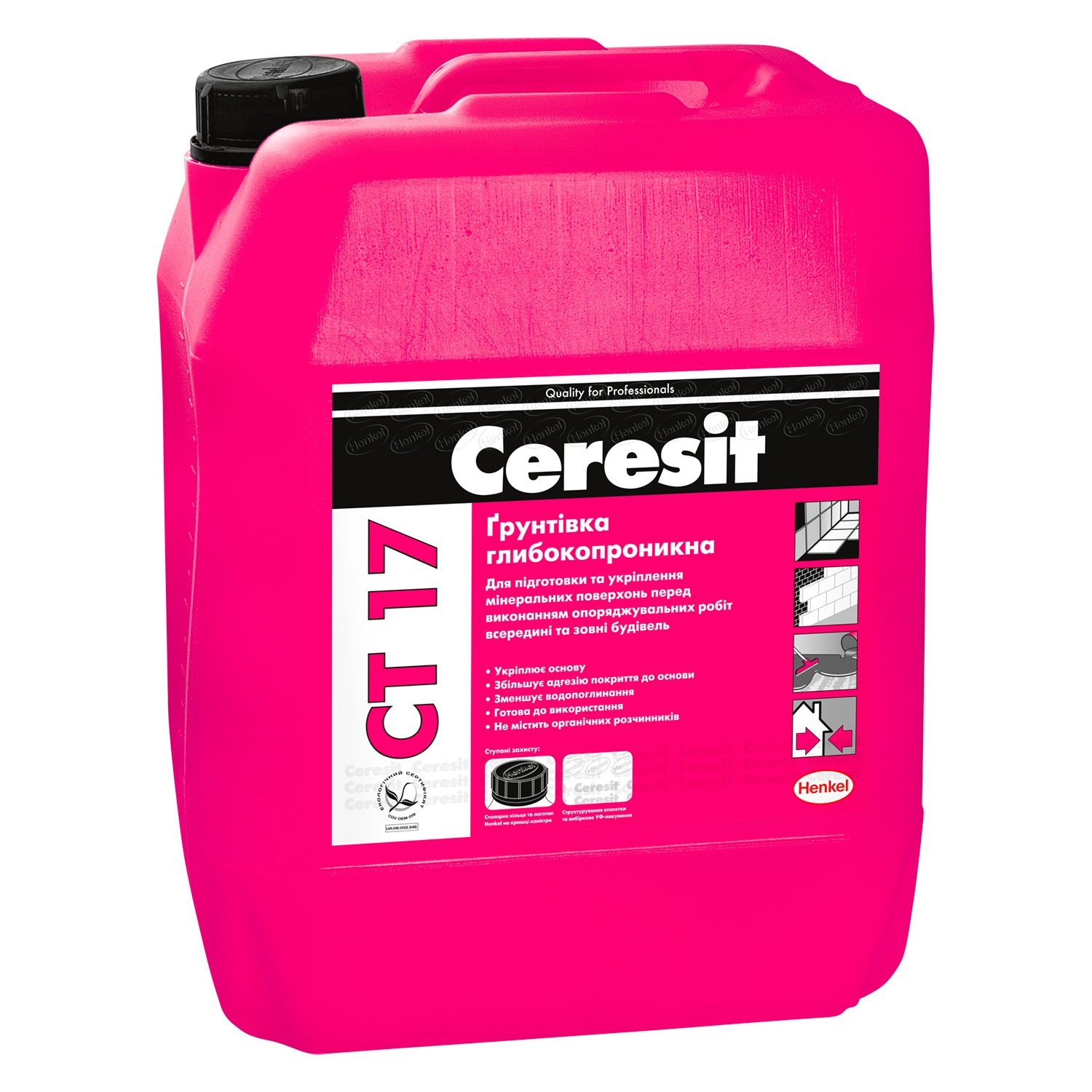 Ґрунтовка Ceresit CT 17 є незамінним інструментом для ремонту будівель. Вона використовується для просочення і зміцнення покриттів перед нанесенням різних оздоблювальних матеріалів. Застосовується на пористих і вологопоглинальних поверхнях (бетоні, цеглі, гіпсі, штукатурці), а також сприяє збільшенню адгезії.