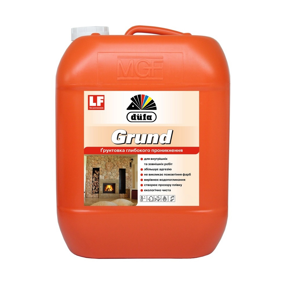 Düfa Grund – це глибокопроникна ґрунтовка для внутрішніх та зовнішніх робіт. Застосовується для підготовки основи перед нанесенням лакофарбових покриттів та під час виконання будівельних робіт: нанесення штукатурки, шпатлювання, наклеювання шпалер, облицювання плиткою та влаштуванні підлог. Утворює прозору плівку після висихання.