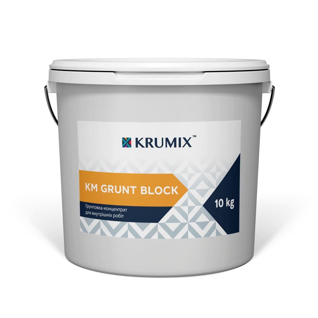 Krumix КМ Grunt Block – ц еґрунтовка-концентрат для внутрішніх робіт. Ґрунтовка на основі стирол-акрилової дисперсії призначена для попередньої обробки поглинаючих поверхонь. Ґрунтовка не містить розчинників і летючих речовин.