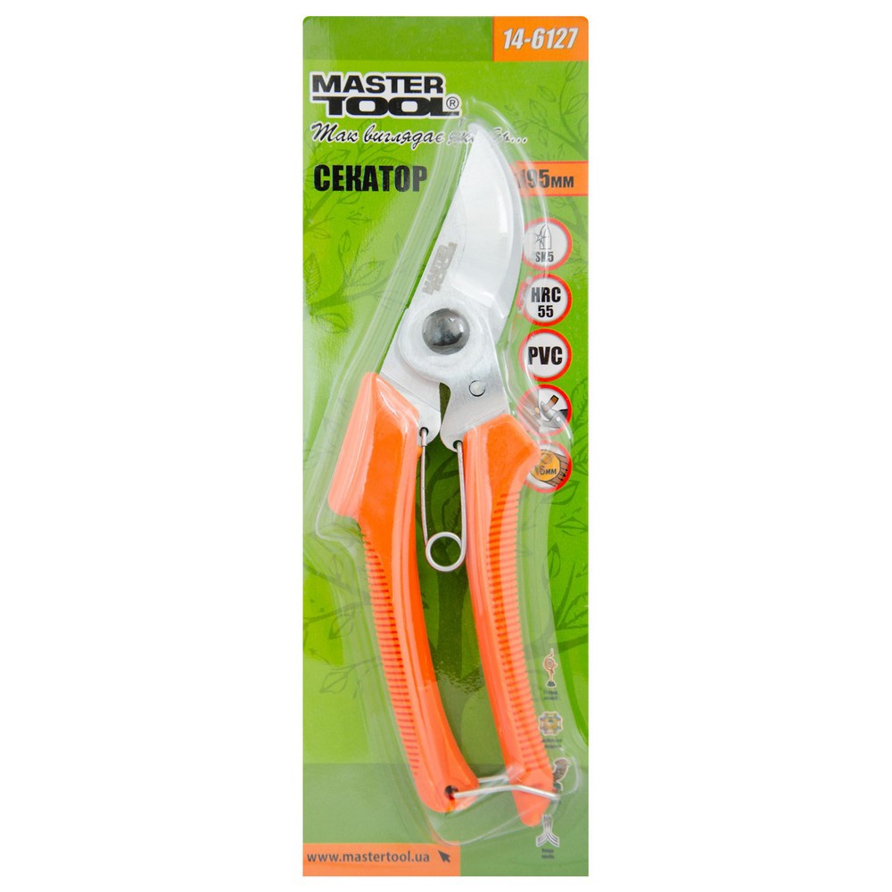 Секатор садовий MasterTool застосовується для обрізки кущів, тонких гілок і пагонів, при формуванні та проріджування крони дерев, чагарників, також використовуються при зборі винограду. Виготовлений з високоякісної сталі. Має механізм зворотної пружини, що істотно прискорює роботу з дрібними гілками. При транспортуванні передбачена функція блокування лез.
