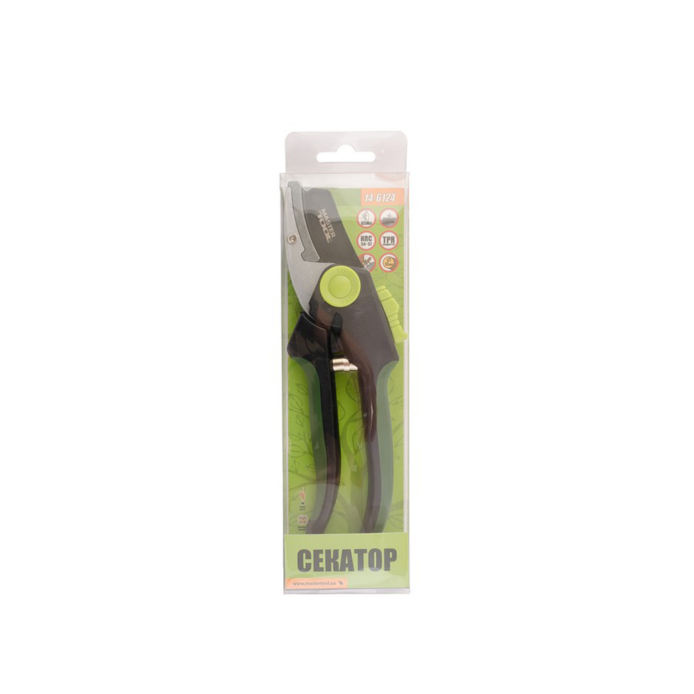 Секатор садовий MasterTool застосовується для обрізки кущів, тонких гілок і пагонів, при формуванні та проріджування крони дерев, чагарників, також використовуються при зборі винограду. Виготовлений з високоякісної сталі. Має механізм зворотної пружини, що істотно прискорює роботу з дрібними гілками. При транспортуванні передбачена функція блокування лез.