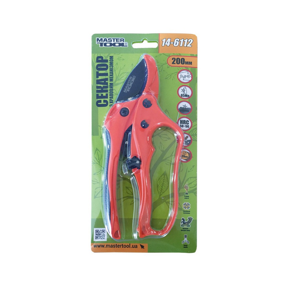 Секатор садовий MasterTool з храповим механізмом призначений для обрізки гілок дерев, чагарників діаметром до 30 мм. Лезо виготовлено з високовуглецевої сталі. Пластиковий фіксатор надійно зберігає секатор в складеному вигляді.