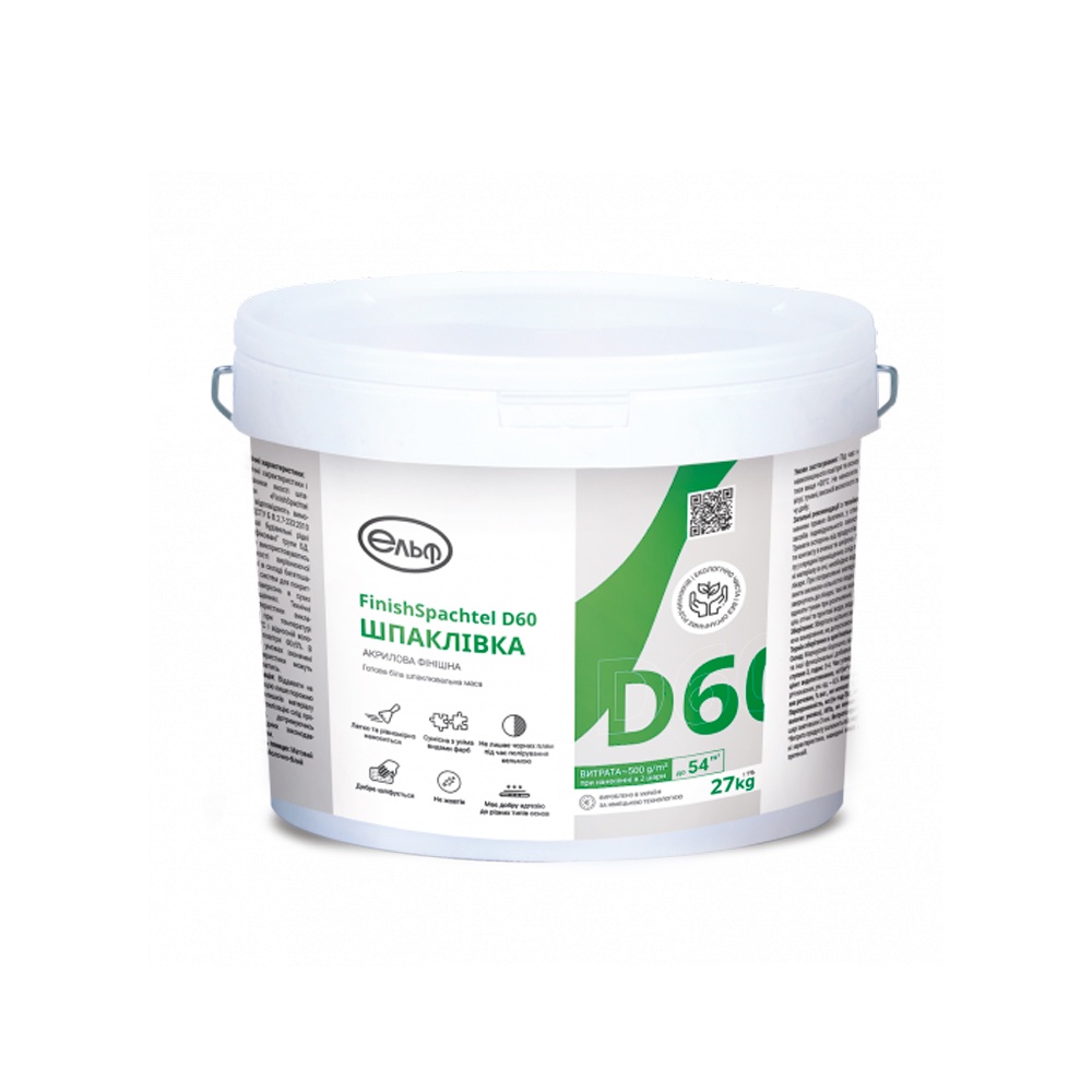Шпаклівка Ельф Д-60 являє собою суміш наповнювачів і різних допоміжних речовин у водній дисперсії акрилового сополімеру. Дозволяє отримати ідеально білу гладку поверхню, яка легко шліфується абразивним папером або сіткою і забарвлюється. Застосовується для внутрішніх оздоблювальних робіт: вирівнювання цементно-вапняних, бетонних поверхонь, ДСП, ДВП, OSB, а також стиків гіпсокартонних плит.