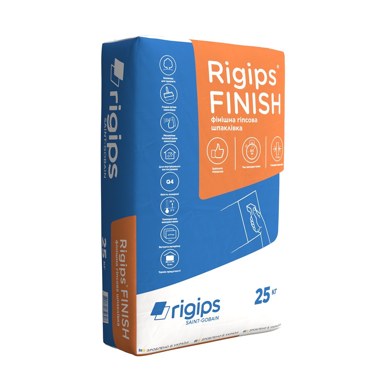 Rigips FINISH – це фінішна гіпсова шпаклівка ручного та механізованого нанесення для фінішного вирівнювання стін та стель в середині приміщень. Завдяки використанню високоякісної сировини шпаклівка має білий колір та підвищнні фізико-механічні властивості, що значно полегшує роботу та експлуатацію готового покриття.