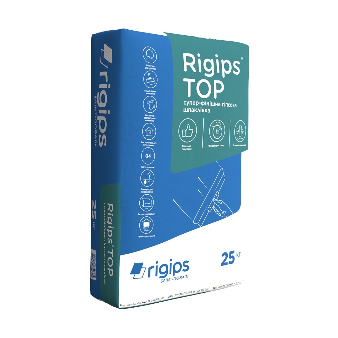 Rigips TOP – це супер-фінішна гіпсова шпаклівка ручного та механізованого нанесення для фінішного вирівнювання стін та стель в середині приміщень. Завдяки використанню високоякісної сировини шпаклівка має білий колір та підвищені фізико-механічні властивості, що значно полегшує роботу та експлуатацію готового покриття.