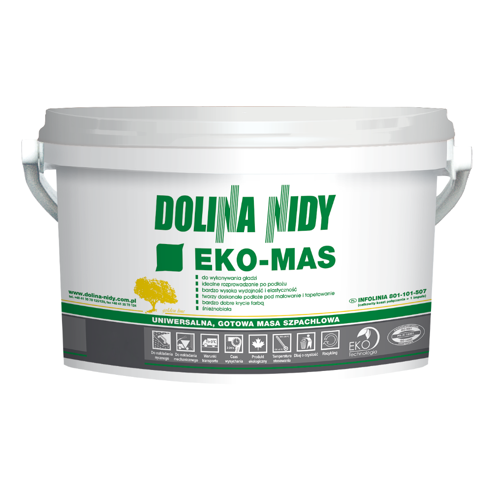 Atlas Dolina Nidy Eko-Mas — це готова до використання фінішна шпаклювальна маса у вигляді білої пасти, що представляє собою композицію смоляних сполучних, мінеральних наповнювачів і облагороджуючих добавок. Консистенція маси пластична, підібрана таким чином, що полегшує нанесення та обробку матеріалу. Готова шпаклівка Eko-Mas характеризується хорошою адгезією до основи та коротким часом висихання. Після висихання її можна легко відшліфувати, завдяки чому можна отримати дуже гладку поверхню, яка є чудовою основою для фарбування та наклеювання шпалер.