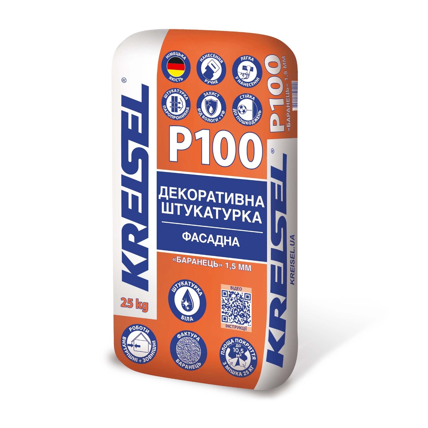 Kreisel P100 – це високоякісна мінеральна суха штукатурна суміш заводського виготовлення. До складу суміші входять мінеральні в’яжучі речовини, мінеральний заповнювач і модифікуючі добавки. Після змішування з водою утворює штукатурну масу для нанесення рельєфних штукатурок. Після затвердіння стає водо- і морозостійкою. Володіє високою паропроникністю, адгезією до основи та стійкістю до атмосферних впливів. Застосовується всередині і зовні будівель. Штукатурна суміш призначена для ручного нанесення на рівний і стійкий шар мінеральних традиційних штукатурок, на гіпсокартонні та гіпсоволокнисті плити, а також на базовий армований шар у системах утеплення зовнішніх стін будинків ТМ Kreisel. У залежності від часу витримки штукатурки, інтенсивності та напрямку руху формування малюнку можна отримувати різні фактури “баранець”.