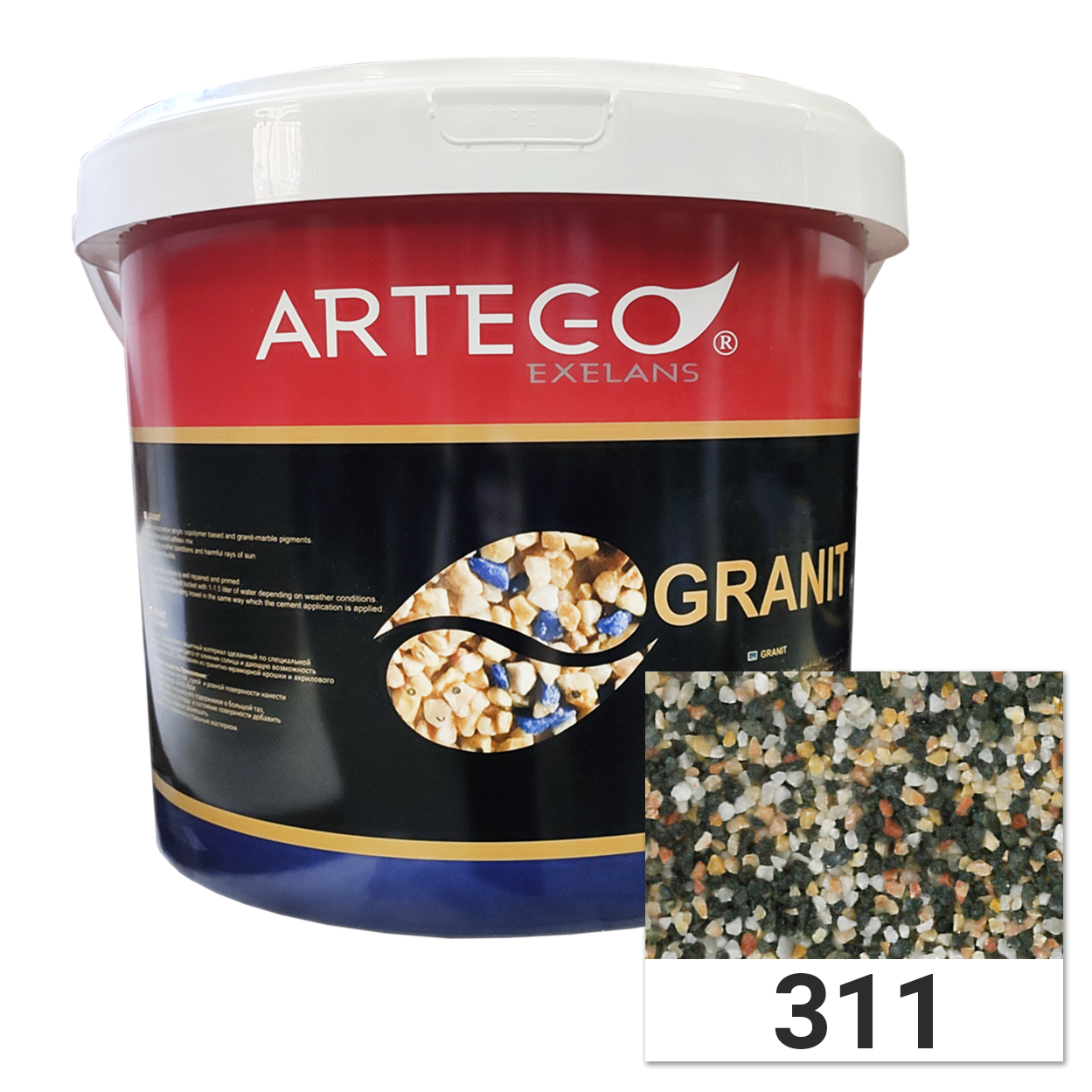 Artego Granit – це композиційне декоративне покриття на основі натуральної нефарбованої гранітно-мармурової крихти різних кольорів і акрилового полімеру.