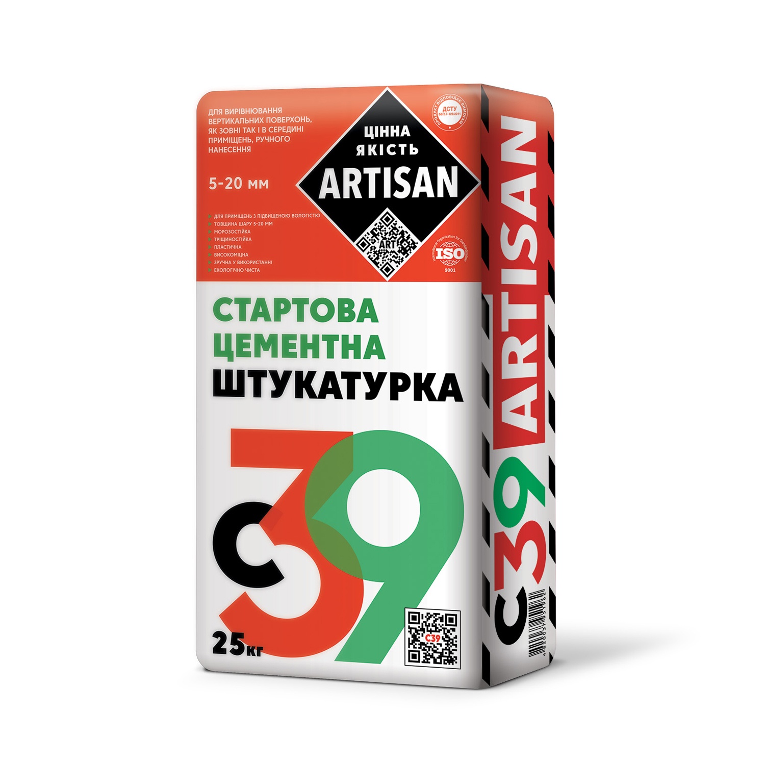 Artisan C-39 – це стартова цементна штукатурка , ручного нанесення застосовується всередині та зовні приміщень для вирівнювання вертикальних поверхонь, швів між панелями, ремонту щілин та отворів, обробки відкосів, арок тощо, шаром нанесення 5-20 мм на будь-які мінеральні поверхні (бетонні, кам’яні, цегляні, піно-газобетонні). Суміш завдяки спеціальним добавкам, зручна у використанні, має високу адгезію до основи, пластична, морозостійка, паропроникна, не утворює тріщини.