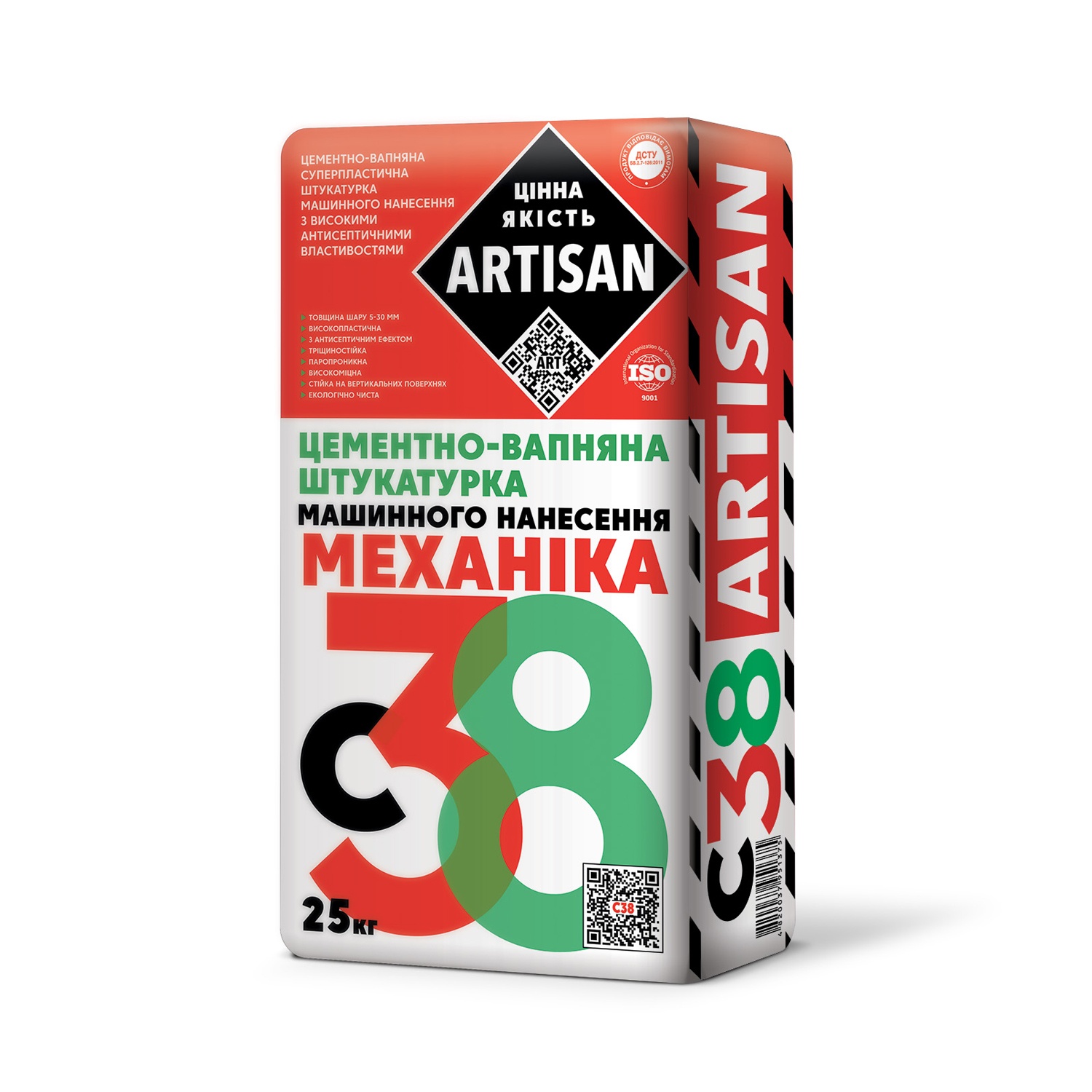 Цементно-вапняна штукатурка ARTISAN C-38 МЕХАНІКА машинного нанесення застосовується всередині приміщень для вирівнювання вертикальних поверхонь, швів між панелями, ремонту щілин та отворів, обробки відкосів, арок тощо, шаром нанесення до 30мм на будь-які типи поверхні (бетонні, кам’яні, цегляні, піно-газо-бетонні). Суміш завдяки спеціальним добавкам, зручна у використанні, має високу адгезію до основи, пластична, морозостійка, паропроникна, з антисептичними властивостями, не утворює тріщини.