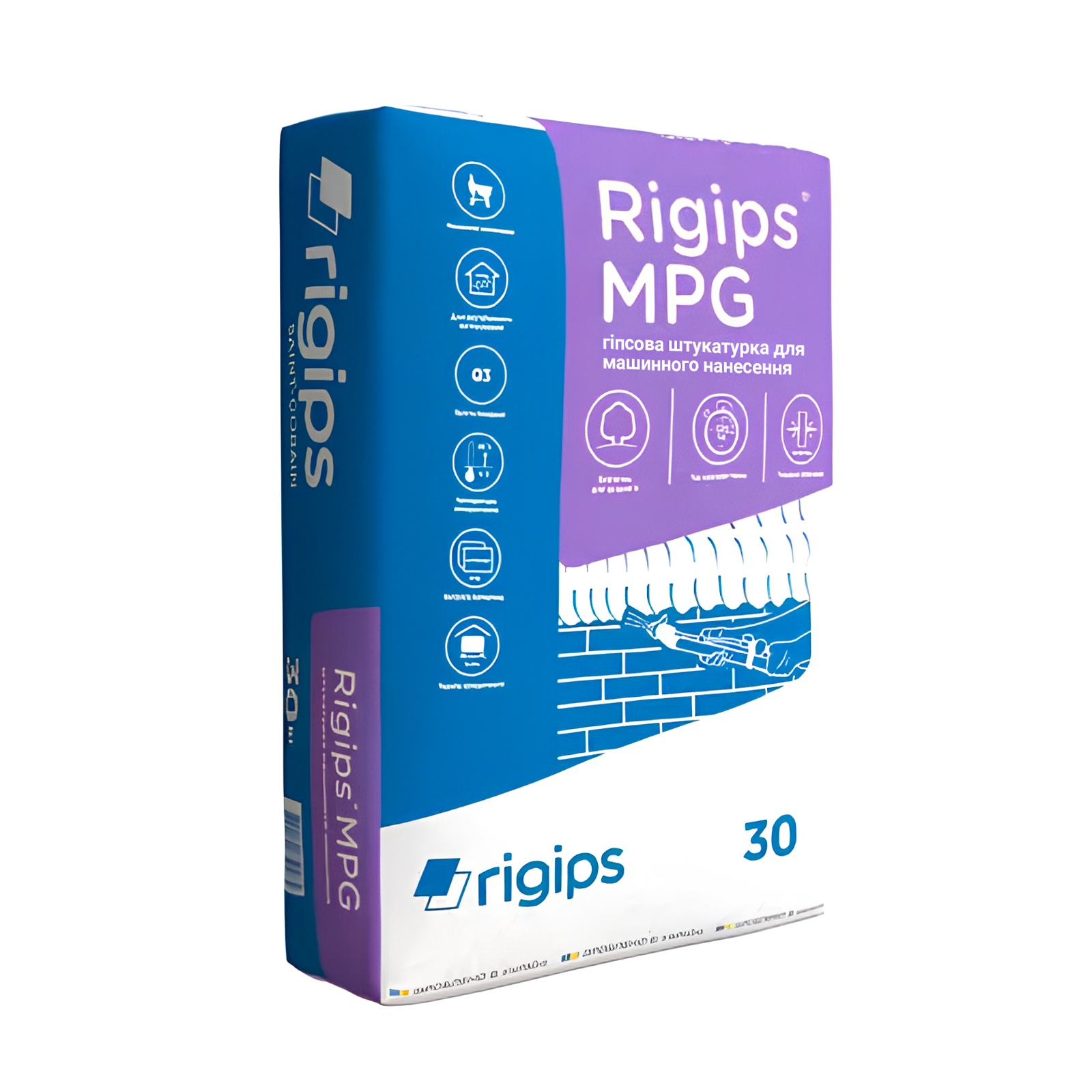 Штукатурка машинна гіпсова Rigips MPG – це сучасна професійна гіпсова штукатурка, що наноситься машинним способом шаром 6-30 мм і дозволяє вирівнювати стіни і стелі всередині приміщень. Допускається також ручне нанесення. Зменшена витрата до 9 кг/мкв/10 мм. Створена для потреб професійних майстрів на основі власної сировини преміум-класу.