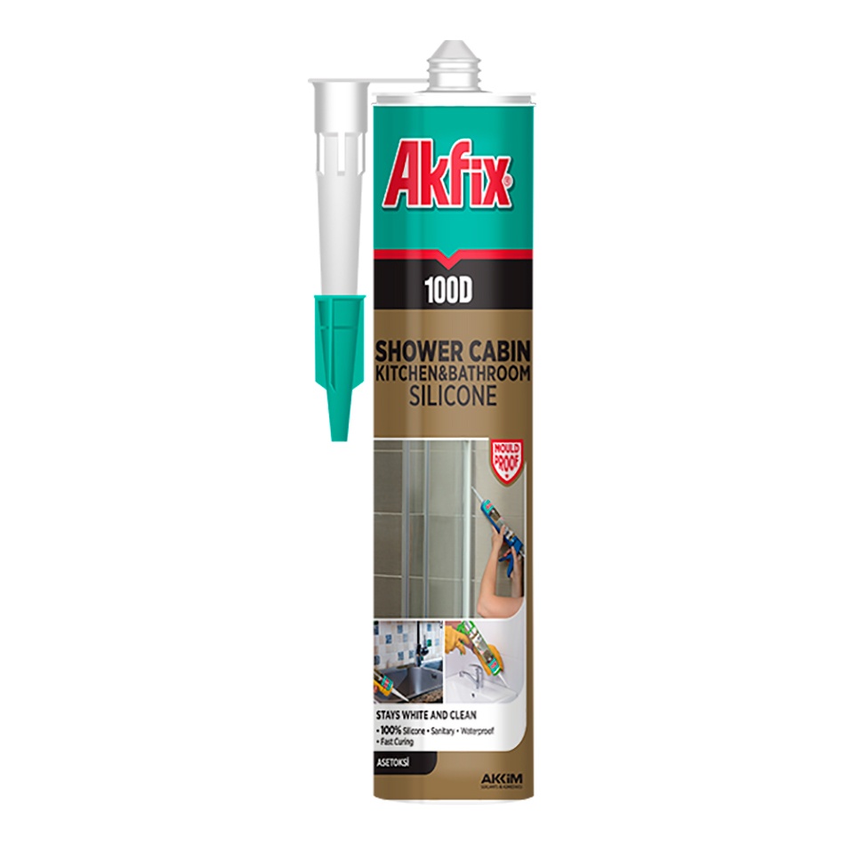 Akfix 100D - cанітарний силіконовий герметик, спеціально розроблений для використання при виробництві і монтажу душових кабін, а також сантехніки у ванній і кухні. Не містить розчинників і володіє стійкими до цвілі властивостями. Це чудовий засіб для герметизації і скління з відмінною адгезією і довговічністю.