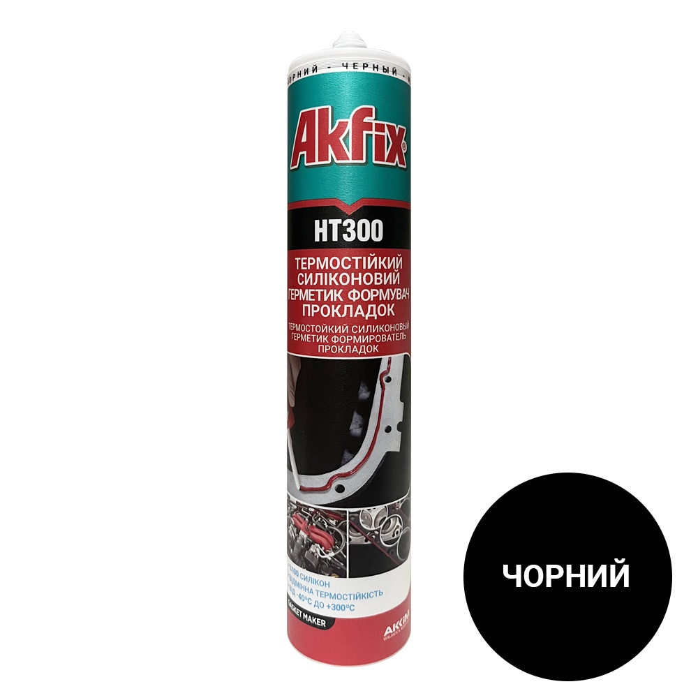 Akfix HT300 - однокомпонентний силіконовий герметик, ідеальний для застосування в місцях, що піддаються впливу високих температур. Твердіє під впливом вологості повітря і утворює дуже щільне еластичне з'єднання. Застосовується для монтажу і герметизації промислових і побутових електропечей, під час ремонту систем опалення, насосів і моторів, автомобілів та при інших роботах в умовах високих температур.