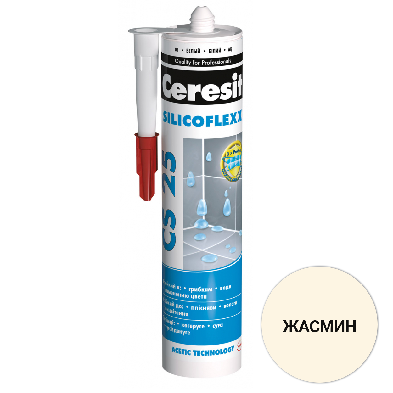 Ceresit CS 25 - це герметик на основі силікону та оцтової кислоти, призначений для заповнення кутових швів з плитки будь-якого виду, крім мармурової, для заповнення і герметизації примикань сантехнічного обладнання в ванних кімнатах, душових кабінах, санвузлах, кухнях та інших приміщеннях з вологим середовищем. Має хороше зчеплення з керамічними плитками, емальованими поверхнями, фарфором і склом.